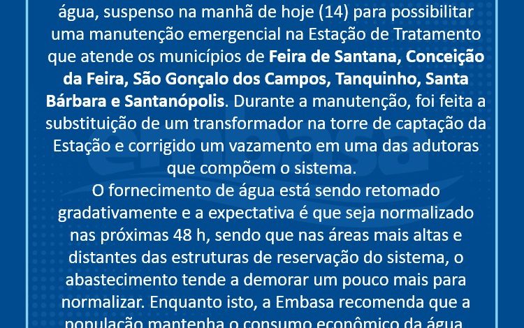 A Embasa informa que já está sendo retomado o abastecimento de água, suspenso na manhã de hoje (14) para possibilitar uma manutenção emergencial na Estação de Tratamento que atende os municípios de Feira de Santana, Conceição da Feira, São Gonçalo dos Campos, Tanquinho, Santa Bárbara e Santanópolis. Durante a manutenção, foi feita a substituição de um transformador na torre de captação de água da Estação e corrigido um vazamento em uma das adutoras que compõem o sistema.